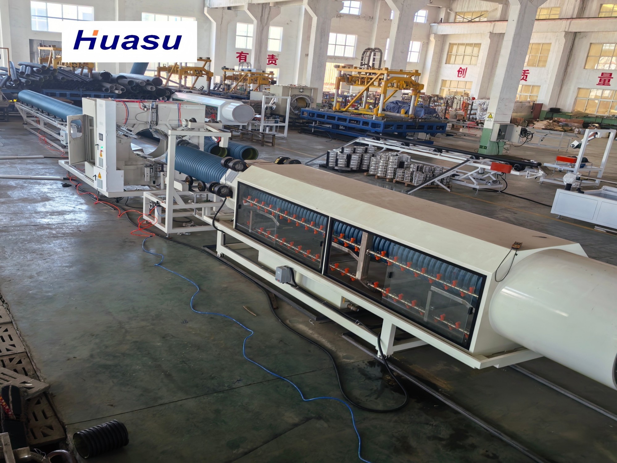 Oluklu boru hattı, Shandong HUASU'nun geliştirilmiş ürününün 3. neslidir. Ekstrüderin çıktısı ve borunun üretim hızı, önceki ürüne kıyasla %20-40 oranında büyük ölçüde artırılmıştır.